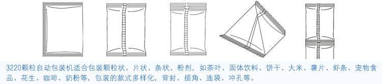 3220顆粒立式自動包裝機使用變頻調速器,關閉機器時自動打開封刀,節省材料,單片機控制系統,故障率低,制袋,填充,計量,封口,印刷,成品輸送一次性完成。是衡水包裝機械顆粒包裝的熱銷機器。包裝款式圖如下: