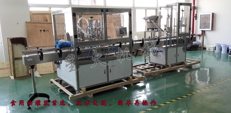 這款食用油灌裝生產線是我司最新研制的灌裝生產線設備,是由四頭灌裝機、自動旋蓋機、貼標機、噴碼機等相關的配套設備組成完善的高效的生產線,是針對食用油類的液體物料灌裝生產所研究設計的組合方案,廣泛適用灌裝于各種油類,如大豆油、潤滑油、食用油、桶裝酒等各個產品及行業需求中,為液體產品行業的發展向前推進一步。以下圖中就是客戶車間使用食用油灌裝生產線的大致情況