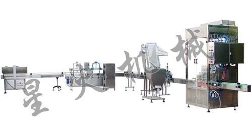 星火自動化包裝肉醬流水線-醬料全自動灌裝流水線主要由6頭灌裝機,自動下外蓋,壓旋式旋蓋機,鋁箔封口機,瓶口收縮機組成,形成一條完整的肉醬流水線。